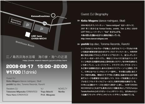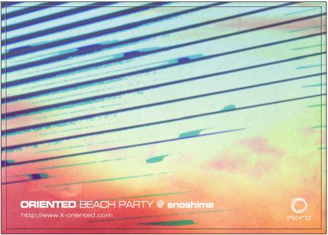 日時:8月17日 場所:片瀬江ノ島,海の家「海への近道」 時間:15:00-20:00 http://www.k-oriented.com/ 以下詳細 *****info********************* ORIENTED ENO-SHIMA BEACH PARTY!! DATE: 17 Augast, 2008 Sunday Place: Umi heno CHIKA-MICHI TIME: OPEN 15:00 START 16:00 CLOSE 20:00 FEE: DOOR 1700yen (with 1 drink) GUEST DJ: Keita Magara / Yoshiki RESIDENT DJ: TAKATOMO MIYASAKA / YUTA HARA VJ: Yasuhide Yokoi/Yuya Adachi/Prof.Akagawa NOVELTY: Noriko and Big SURPRISE!! Guest DJ Keita Magara (dance rodriguez ,Skal) 2004年からテクノ・パーティー『dance rodriguez』をオーガナイズ。 2007年5月からはFumiya Tanaka、yoshiki、Taroと共にLIQUID LOFTでのニューパーティー『Skal』を立ち上げる。今後のさらなる活動の広がりに期待が集まっている。 Yoshiki (Torema Records/op. disc) シンプルなミニマルグルーヴを軸としながらもファニーでひねりの効いた独自の感覚を持ち合わせたテクノDJ/トラックメイカー。 1990年代中盤に地元大阪にてDJとしてのキャリアをスタート。自らのレギュラーパーティをオーガナイズ. 2003年にはベルリンやロンドンへ留学し、その頃には既に自らトラック制作も開始。現地のクラブで培った感性と自身のDJにおける独自でユニークな感覚を十分に活かしつつ、DJユーズを前提としたシンプルなミニマルトラックにフォーカスした制作を現在も続けている。 ******************************************** 2008/08/07(Thu) 22:20:28