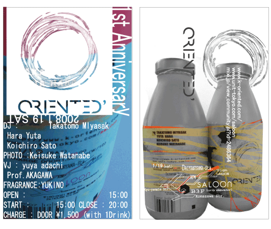 ぜひ遊びに来ておくんなまし。 CKはドイツにいるので、いけないんですが、 ドイツから写真送ってスライドショーは引き続きやります。 いい音なってるし、グラフィックのいい絵流すんで、ぜひぜひ。 以下、party info **************************************************************************** 一個の音の、孤立性と存在感。はじめに、音は、静かに、繰り返す。 音は、散りばめられたビー玉。集まり、そしてまた散らばり、鼓膜を揺さぶる。 ビートは、静かな水面に落ちる雫。SALOONの空間に、広がる波紋は、壁を強く震わせる。 トラックとトラックのレイヤード。リズムの再構築、ストーリーが生まれ、高まるグルーヴが脈動する。 グラフィックアート、フレグランス、フォトスライドショー ORIENTED一周年記念! TEXT by Keisuke Watanabe **********Information********** ORIENTED 6th"1st Anniversary" DATE: 19 Januarry 2008 @ SALOON DJ: Takatomo Miyasaka / Yuta Hara / Koishiro Sato 2007/12/09(Sun) 12:39:07